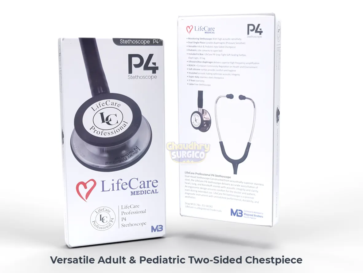 The Lifecare Professional P4 Stethoscope Standard Edition is a premier diagnostic instrument meticulously crafted from acoustically-superior stainless steel. Designed for doctors and healthcare professionals, it delivers accurate auscultation of heart, lung, and Korotkoff sounds with exceptional integrity and clarity. Its ability to amplify subtle sounds allows you to detect faint abnormalities and patient changes even in the most critical and challenging environments, such as ED, ICU, and cardiac ICU. P4 Lifecare stethoscope price in Pakistan is most economical.